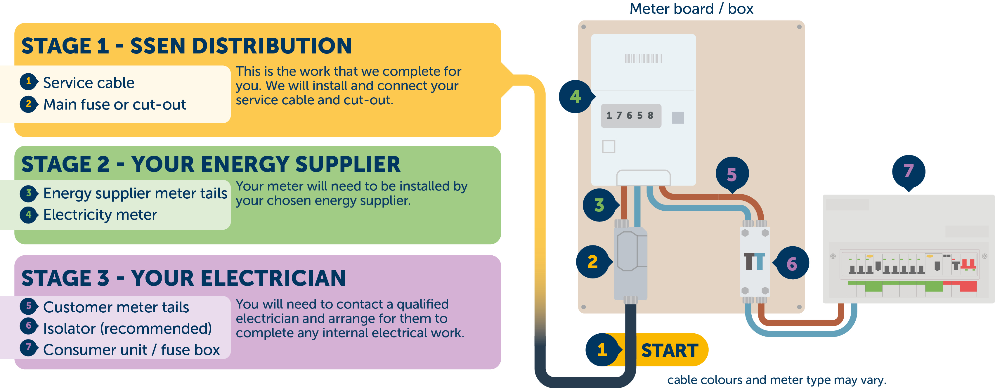 There are three key stages involved in completing increasing or reducing your electricity connection. In the diagram below, the yellow sections show the parts of your existing electricity supply that SSEN will update or replace. This includes equipment such as your service cable and cutout. Each stage is color-coded to show who is responsible for each part of the process.
