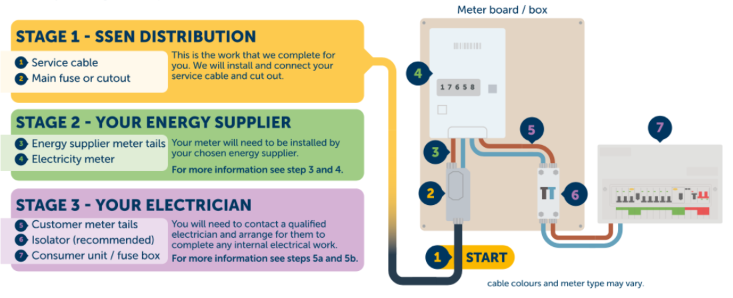 There are three key stages involved in completing your new electricity connection. In the diagram below, the sections shown in yellow highlight the equipment we install, including your service cable and cut‑out. Each stage is colour‑coded to show who is responsible for the work: